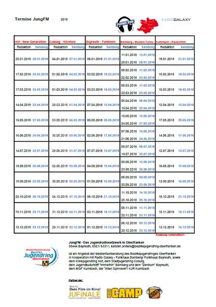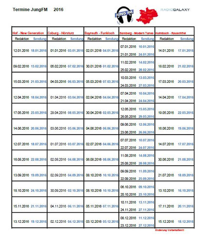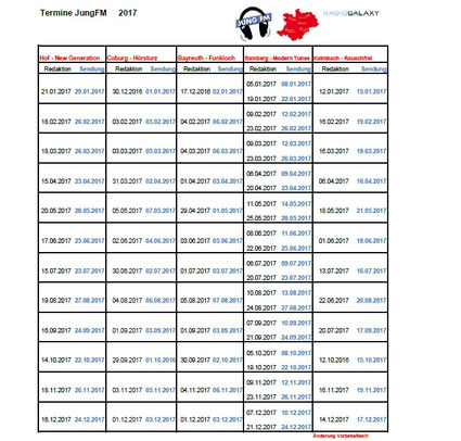 Die aktuellen Produktionstermine können per Mail an redaktion@jungfm.de erfragt werden. Hier ein Blick ins Archiv: