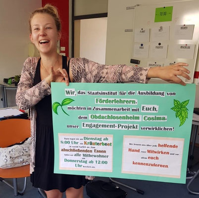 Im Rahmen des Fachs "Allgemeine Pädagogik" beschäftigen sich die Studierenden des Ausbildungsjahrgangs 2 mit den Möglichkeiten der schulischen Demokratieerziehung und setzen ein Engagementprojekt als eine Form der gelebten Demokratieerziehung in Kooperation mit dem Obdachlosenheim Haus Cosima in Bayreuth um.
